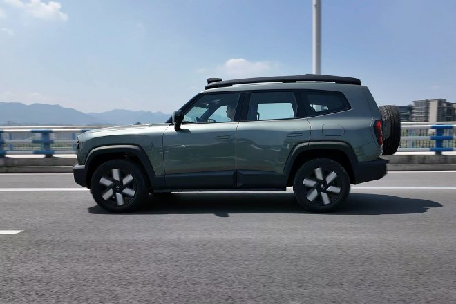 The hidden door handle design on the side of the body is conducive to reducing wind resistance. The hood is pressed down 5 degrees, the waistline is raised 2 degrees, and the waistline and roof line form a cutting surface and angle to bring a strong sense of power. The front and rear raised wheel eyebrows highlight the tough style. In terms of body size, the length, width and height of the new car are 5010/1985/1960 (including spare tire and spotlight) mm, the wheelbase is 2880mm, the approach angle/departure angle reaches 27°/31°, the longitudinal passing angle is 27.3°, and it also has a ground clearance of up to 240mm, the battery pack is 318mm above the ground, and the wind resistance coefficient is 0.35Cd.